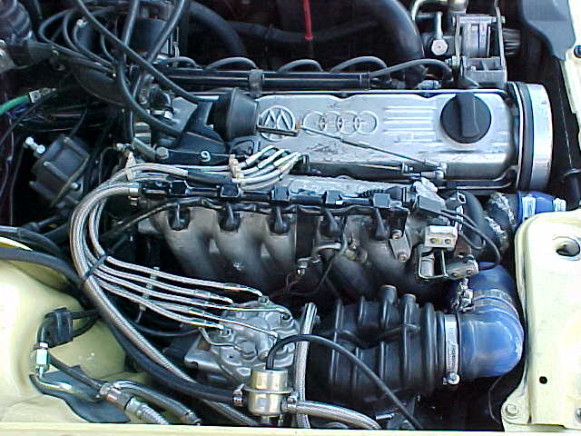 The fuel system is stock CIS-III with 5 additional electronic injectors for high boost situations - normal everyday driving in between SUV's. They are controlled by a laptop programable ECU. The clutch has been enlarged to the 240mm from the Coupe Quattro Cooling is still taken care of by the two stock radiators, and the 5000 oil cooler. These all could use upgrading in the future. The 3" exhast has been custom bent from the wastegate back to a 3" CAT through a 3" Borla. Pictures Front view Drivers side view Intake close-up Throttle likage Injector close-up Intercooler Auxilary water pump Setrab Oil Cooler Home |